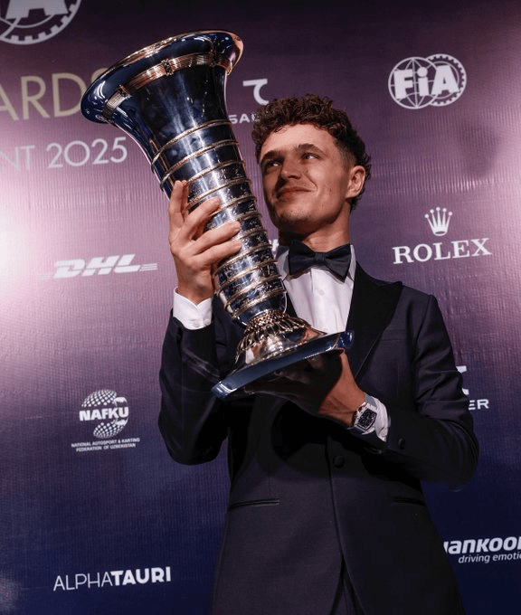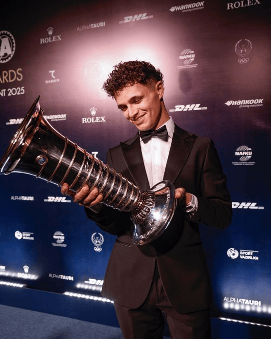 虎扑12月13日讯国外汽联2025年度受奖典礼在乌兹别克斯坦王人门塔什干举行,迈凯伦车手兰多-诺里斯在典礼上领取了2025年度F1车手总冠军的奖杯。
