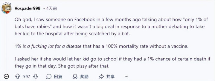 “天哪,几个月前我在Facebook上看到有东说念主说,‘唯一1%的蝙蝠佩带狂犬病毒’,还说这没什么大不了的。那时一位母亲正踌躇要不要带孩子去病院,因为她的孩子被蝙蝠合手伤了。