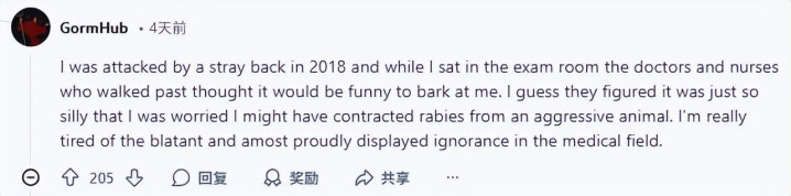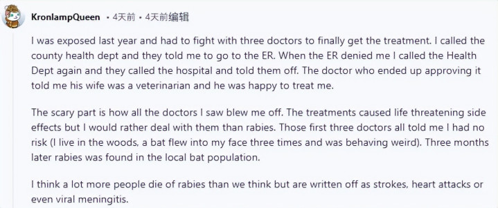 “我旧年战役过狂犬病,为了调理,我跟三个大夫交涉了很久。我打电话给县卫生部,他们让我去急诊室,急诊室间隔调理后,我又打电话给卫生部,他们终末把病院训了一顿我才接管了调理。