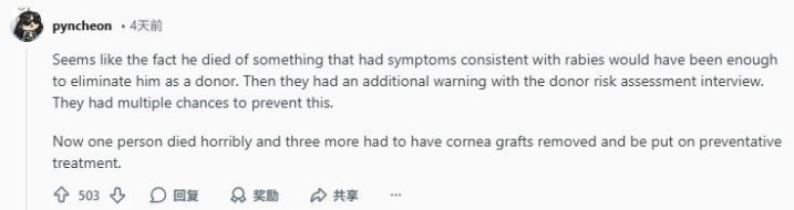 “他死于一种症状与狂犬病相符的疾病,这本应足以让他失去捐赠资历。何况在风险评估中,他还建议了突出的告戒。病院本有许多契机不错幸免这种情况发生的。