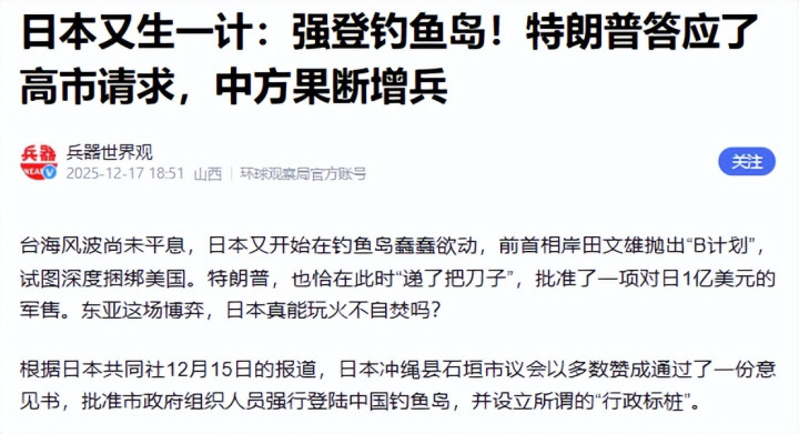 这是一次荒原的计策合击。前脚日本拉着右翼议会要在垂钓岛“竖立行政标注”,后脚特朗普随即书记对台湾110亿好意思元军售大单,创造了好意思史上对台军售最高记载。中日好意思台四方全上线,这根红线,正在被平直踩死。